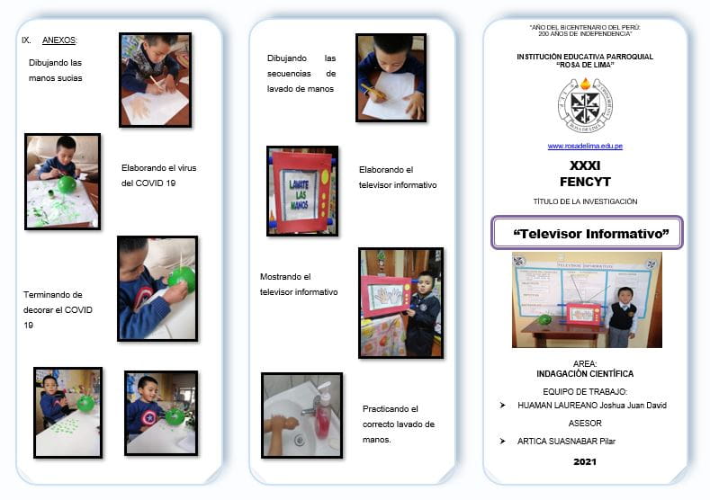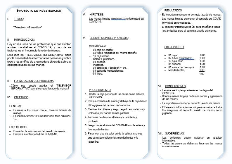 Este proyecto "TELEVISOR INFORMATIVO" parte de la importancia que tiene para los niños, niñas, aprender el correcto lavado de manos debido a que nuestra salud esta siendo afectada por la COVID-19 a nivel mundial, en especial nuestro Perú y dentro de él a San Jerónimo de Tunan, provocando muertes y siendo necesario lavarse las manos constantemente.
