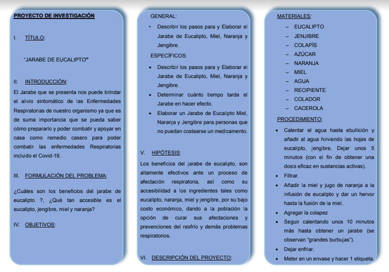 El presente trabajo se centra en realizar un jarabe de eucalipto mediante la utilización de las plantas medicinales que se remontan a los orígenes más antiguos de la humanidad.