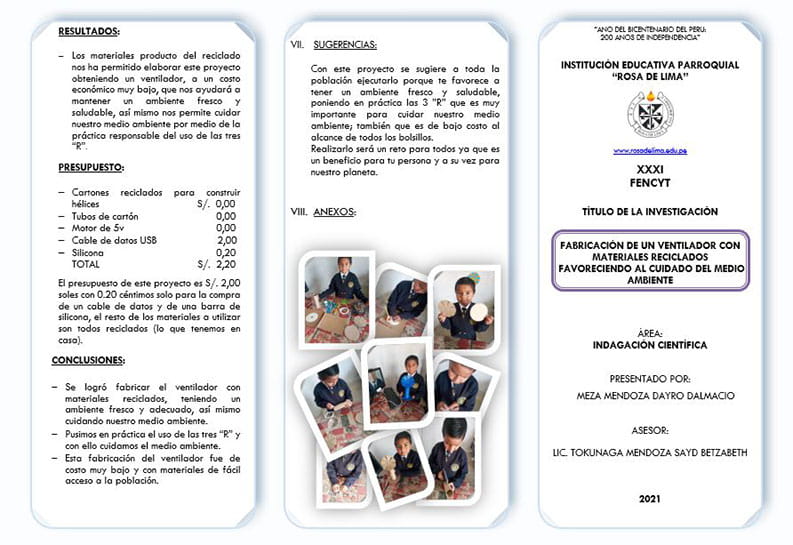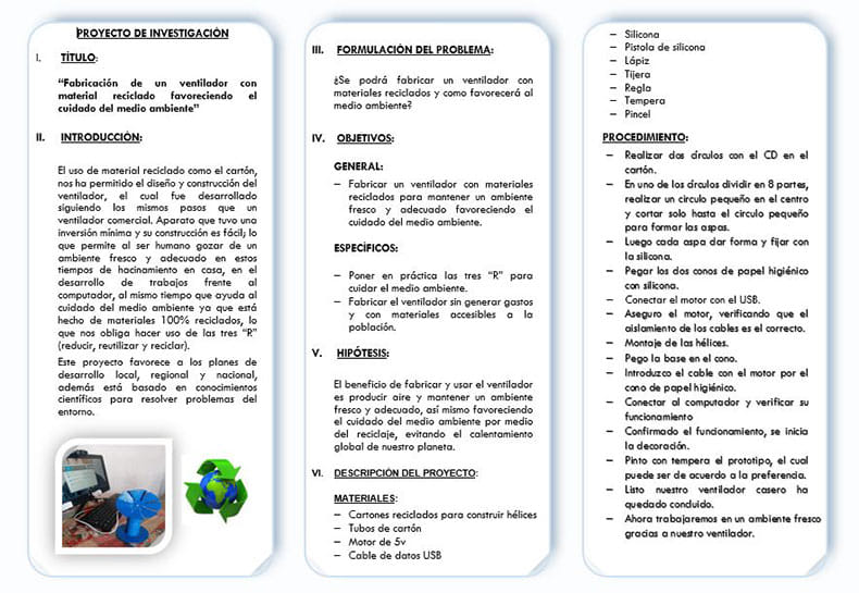 Este proyecto enfatiza en primer lugar la construcción de un ventilador, sin descartar la posibilidad de crear otros objetos, haciendo uso de materiales reciclados que no se utiliza en el hogar, logrando así el bienestar de la persona en estos tiempos de pandemia, que ha producido efectos negativos en la salud y economía de muchos hogares.