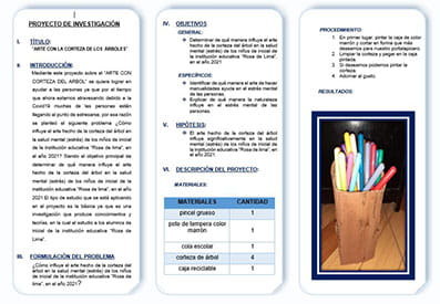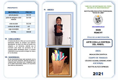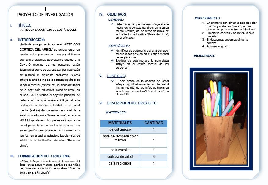 El proyecto “ARTE CON LA CORTEZA DE LOS ÁRBOLES" pretende ayudar a los niños con el arte de hacer productos con la corteza del árbol, así relajarnos por las circunstancias que ahora estamos atravesando debido a la pandemia por la Covid 19 que ocasionan estresarse por ello el arte va ayudar con los atributos de la naturaleza.